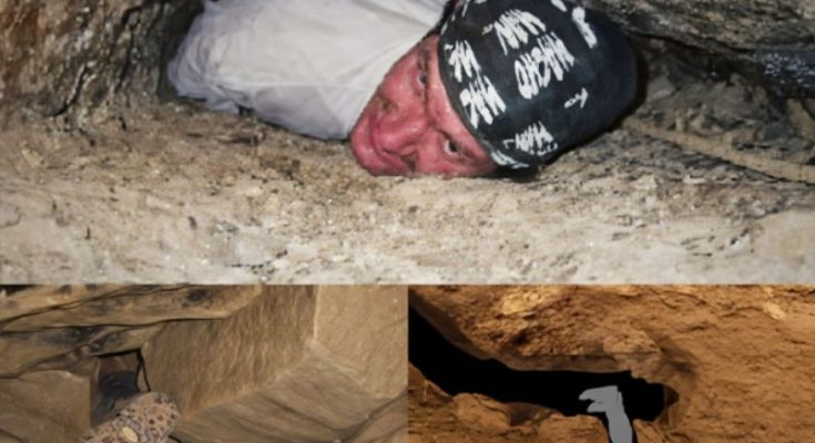 The image presents a scene that immediately evokes a sense of confinement and tension. A person is wedged tightly inside a narrow crevice in the earth, their body pressed against rough stone, with barely enough space to move. Additional views from different angles reinforce the severity of the situation, showing just how restricted the environment is. There is little room to turn, let alone escape بسهولة. Though the moment is frozen in a single frame, it suggests a deeper story about human curiosity, the drive to explore, and the risks that come with entering the unknown.