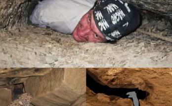 The image presents a scene that immediately evokes a sense of confinement and tension. A person is wedged tightly inside a narrow crevice in the earth, their body pressed against …